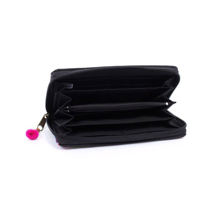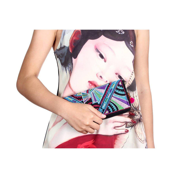 Our Wallet limited edition collection is created from gorgeous embroidery in contrasting, colorful hues. This gorgeous wallet combines an eye catching geometric design with intricate embroidery. Has twelve slots for cards inside, two dividers and a zippered pocket for coins. It even fits a smart phone!