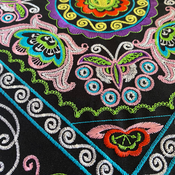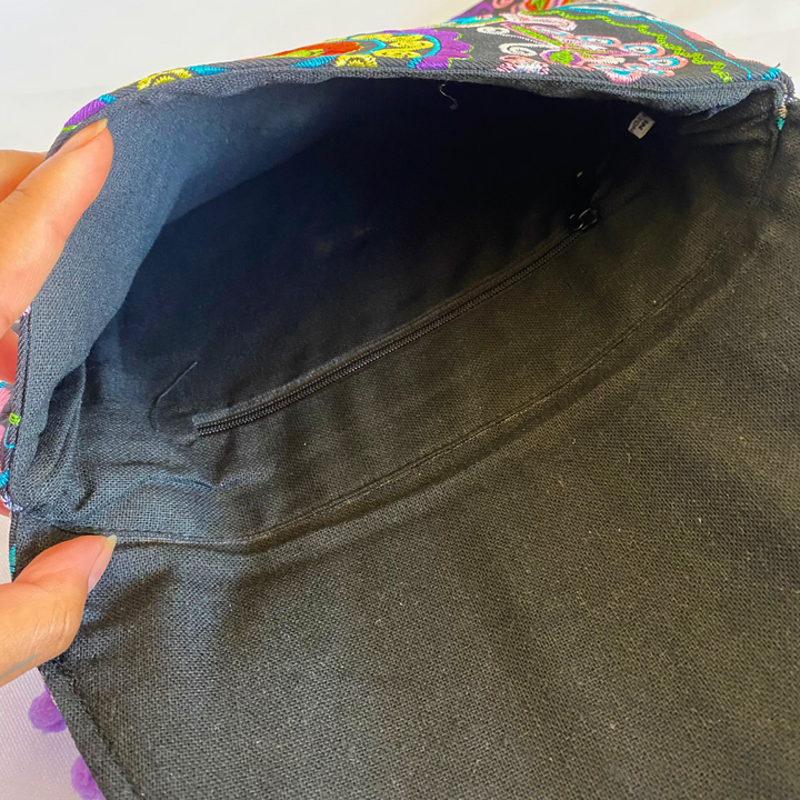 Elevate your style with our vibrant pom-pom clutch, inspired by Thai textiles and handmade by Ae in the Highlands of Thailand. This colorful accessory is adorned with adorable pom-poms, showcasing the intricate hand-embroidery and adhering to fair trade practices. Stand out with stunning bright colors and support ethical craftsmanship with every use.