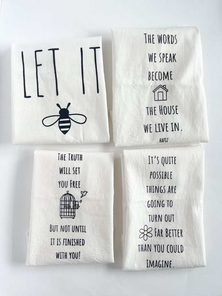 Tea Towels are a fun way to add a message to our beautiful “mess” of a kitchen. The crisp white cotton is printed with the words that bring your personality to your kitchen space. And they are a working cotton towel, not just a pretty piece of art!
