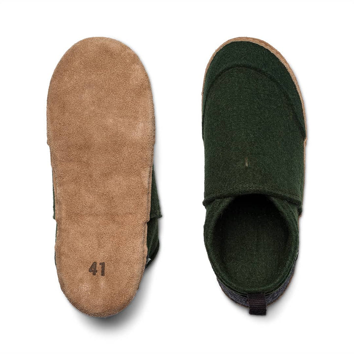 Tengries are made from hand-cut wool felt and stitched for a flexible, foot-hugging fit. With a non-slip leather sole and hidden elastic, they slip on easily and stay comfortably in place all day.