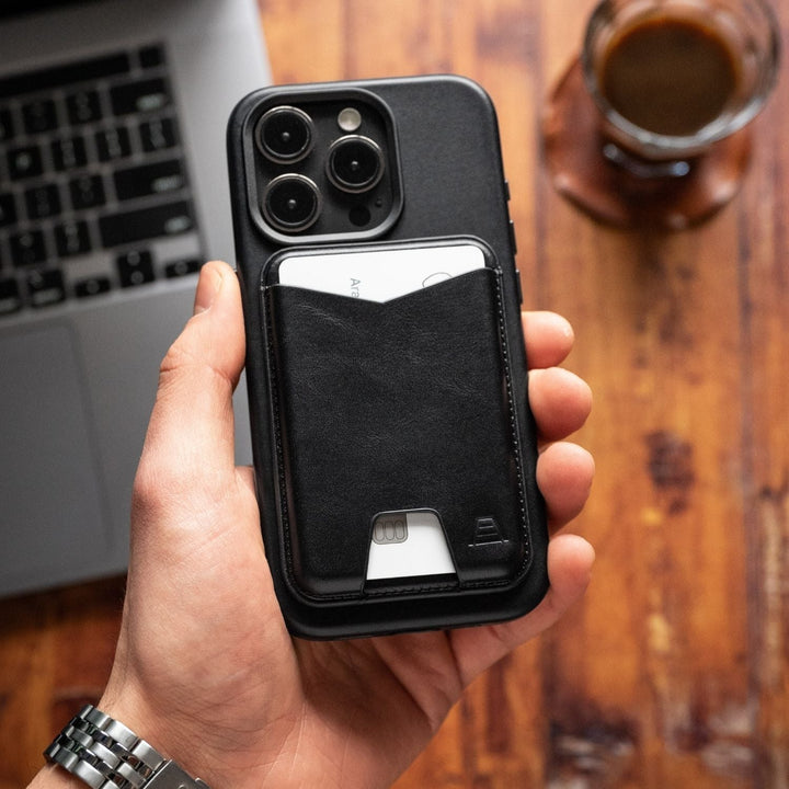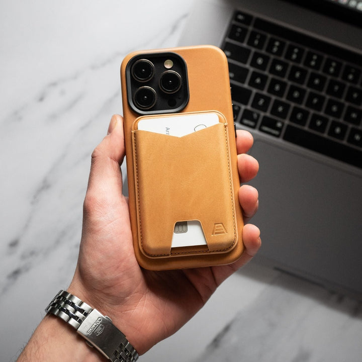 The Mag is a minimal functional wallet design made specifically for compatible iPhones. Made with built-in magnets that easily attach to a compatible iPhone or MagSafe compatible phone case. Made to quickly attach and detach from your iPhone for quick card access. The Mag wallet is crafted from premium full grain leather and fits snug and secure on your iPhone —all the while staying soft and developing a rich patina through its lifetime of use.