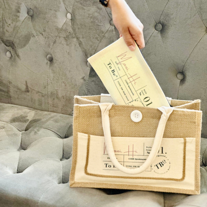Designed, printed and assembled by hand at the To Be Wailuku shop, these bags are limited in quantity. This bag highlights the words Maui, HI. in a beautiful blush rose color.