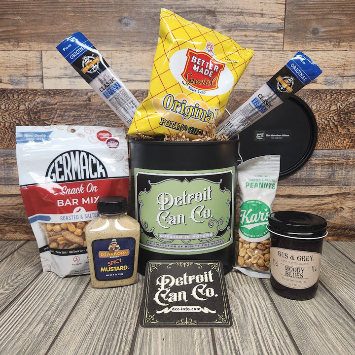 The Marvelous Mitten Can is an ode to the wonderful state of Michigan and its small business owners. Detroit's local brands make their way in offering some tasty snacks and condiments, along with other delicious Michigan bites. A sure pleaser for gift-giving or yourself...and a "thumbs up" to our popular Detroit Can to store anything from kitchen munchies to household supplies. Take a bite of Michigan!