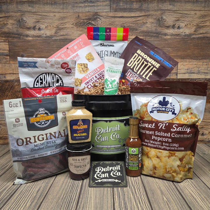The 2 Gallon Michi-Can Collection is double the size of our other cans and is packed with edible delights procured from Michigan, and many from the Detroit area. We look to promote our area businesses and up & coming food producers. The variety in this can will not disappoint, and is a sure win gift, packed with flavorful edibles!