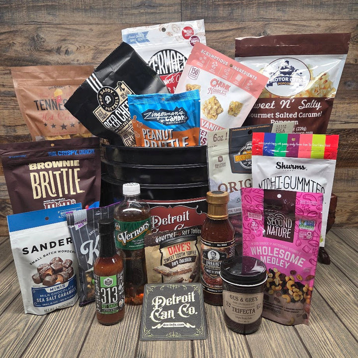 Wowza! This is the Mac Daddy of cans!! From savory to sweet & salty, this is a HUGE representation of Michigan products. Imagine the look on someone's face when they receive this cornucopia of deliciousness. Think office gifts, weddings, birthday/anniversary/holiday celebrations, or just that extra-special gift for that extra-special someone.