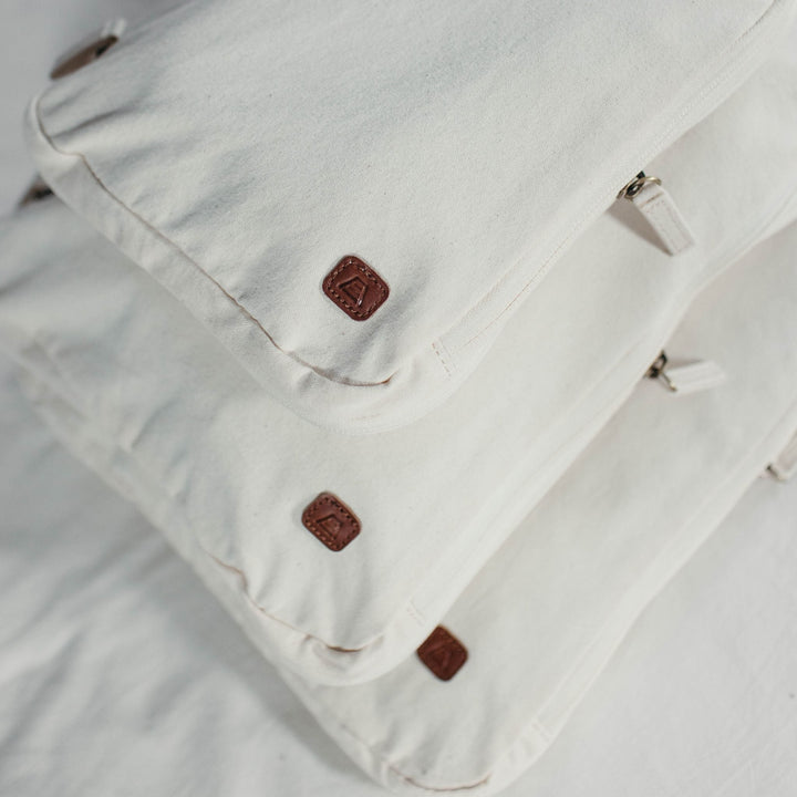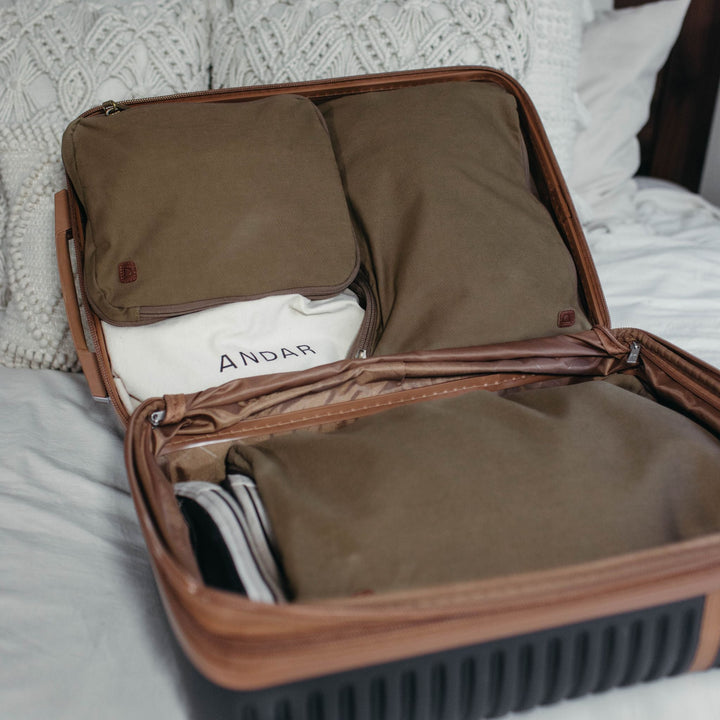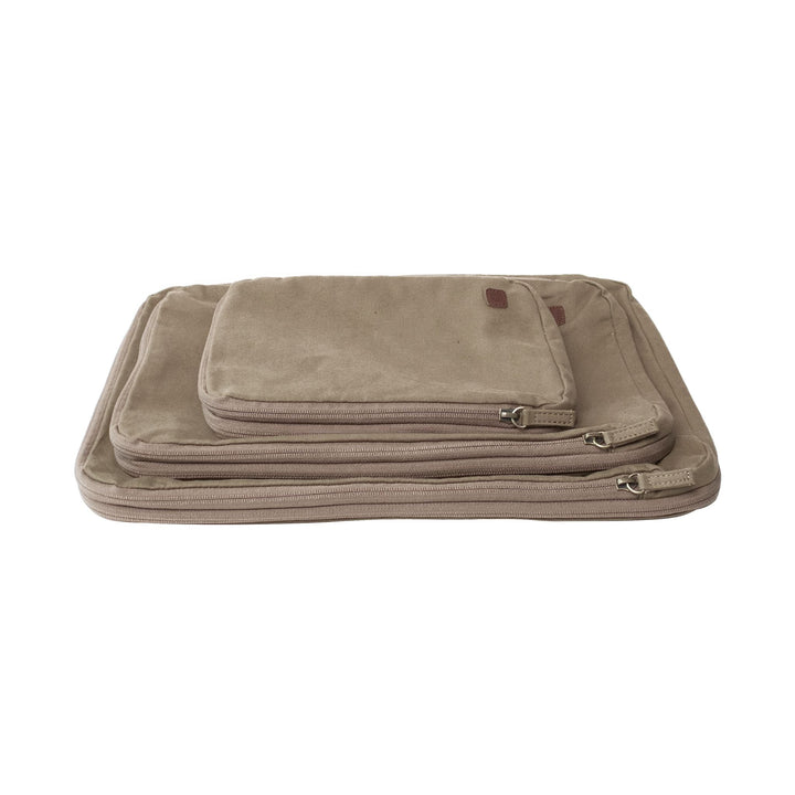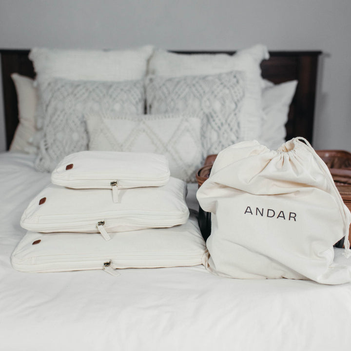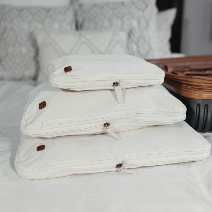 Maximize space and organization in your travels with The Packing Cubes. These durable cubes, made with cotton canvas and full-grain leather accents, are designed to keep your belongings secure and compact. With YKK zippers and a bonus canvas shoe bag, you can easily pack and access your items with ease.