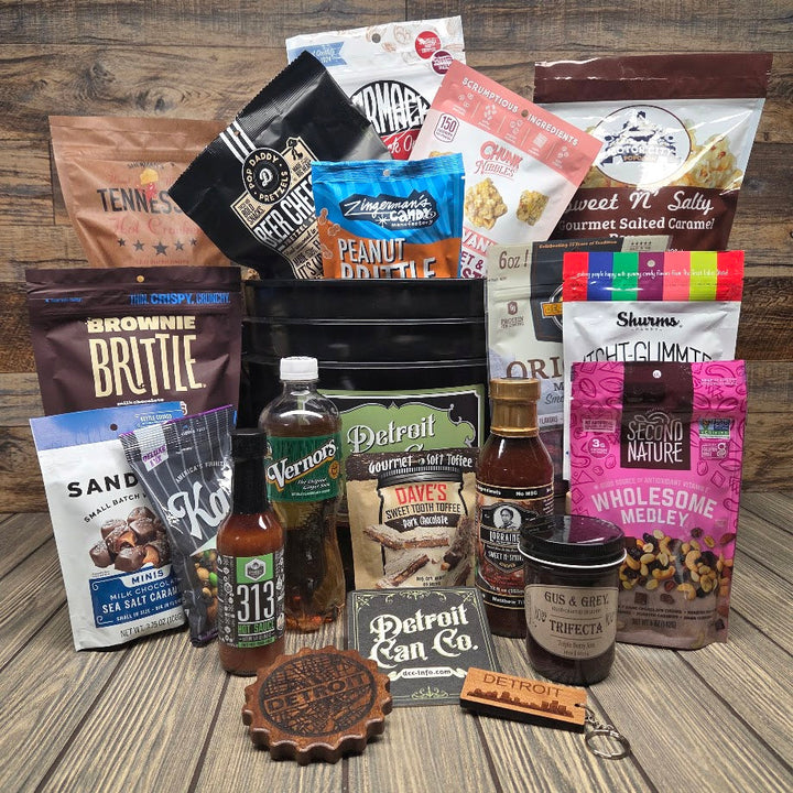 ...and this is a WONDER of a can! Carefully packed in our largest 3.5 gallon size, we've stuffed this with tons of mouth-watering goodies from our spectacular state of Michigan! We tip our hat to Detroit, with a carved wood, magnetic bottle opener, and a custom wood Detroit keychain. Both made right here in the Motor City. Appreciate our great State and its small businesses with this can representing our Water Winter Wonderland!!