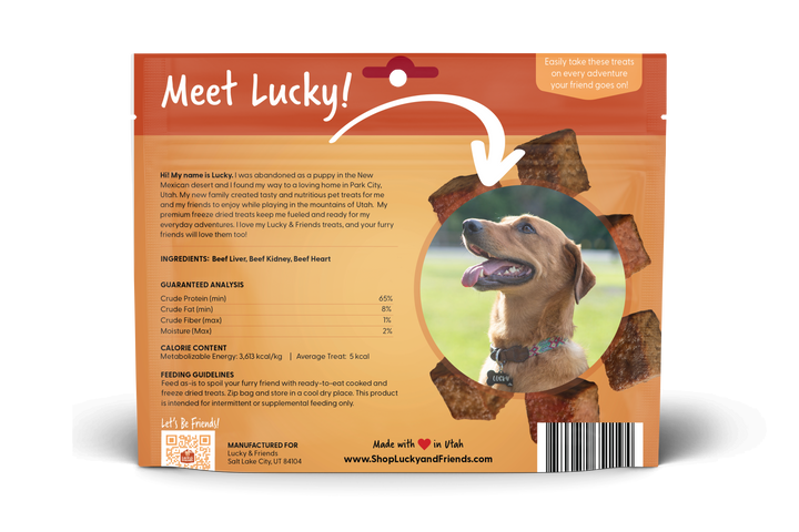 Lucky & Friends premium 100% freeze dried pet treats will excite your pet and have them always on their best behavior. Lucky's fully cooked and freeze dried beef liver, beef heart and beef kidney treats are made with 100% freeze dried, human grade beef liver, beef heart and beef kidney. There are no additives, fillers, water or preservatives added to these treats. As soon as you open the bag, you will see the difference- whole muscle meat, not nasty little pressed cubes, like the other guys have.