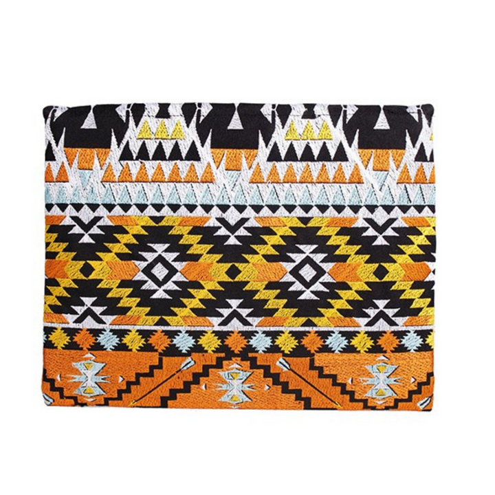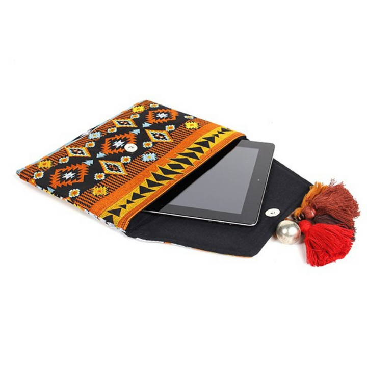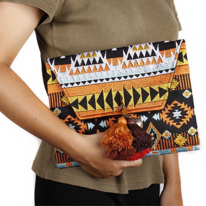 This boho style women's clutch is ethically handmade by women artisans in Thailand. It features an embroidered geometric pattern black cotton lining, adorned with orange-red-brown beaded tassels and bells