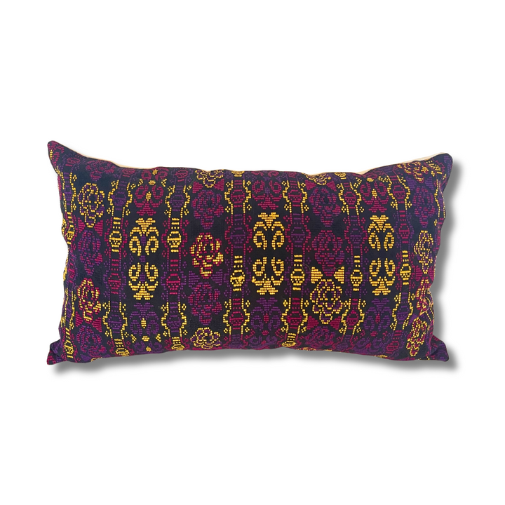 Handmade in Guatemala, our eclectic throw pillow cover is a beautiful fusion of rich color, culture, and tradition. Crafted from repurposed fabric sourced from traditional skirts worn by Maya women in the highlands of Guatemala, each piece features a unique combination of materials and patterns that tells a story of heritage and craftsmanship.