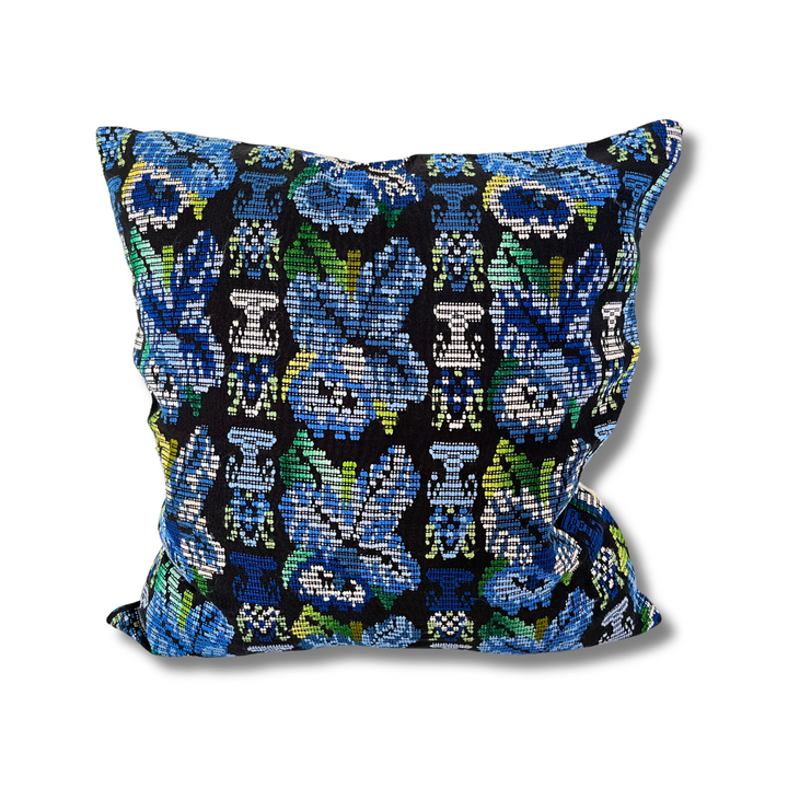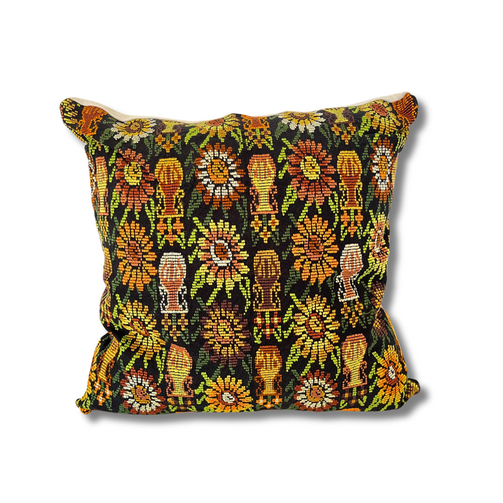 Add a pop of color and cultural heritage to your living space with our handmade eclectic throw pillow cover, crafted by Laura in the highlands of Guatemala. Each cover is a unique blend of repurposed fabric from traditional Maya skirts (corte) and shirts (huipil), creating a stunning mix of materials and patterns.