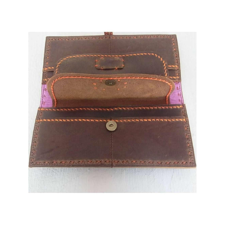 Slots for credit cards inside. Very high quality leather and upcycled fabric.