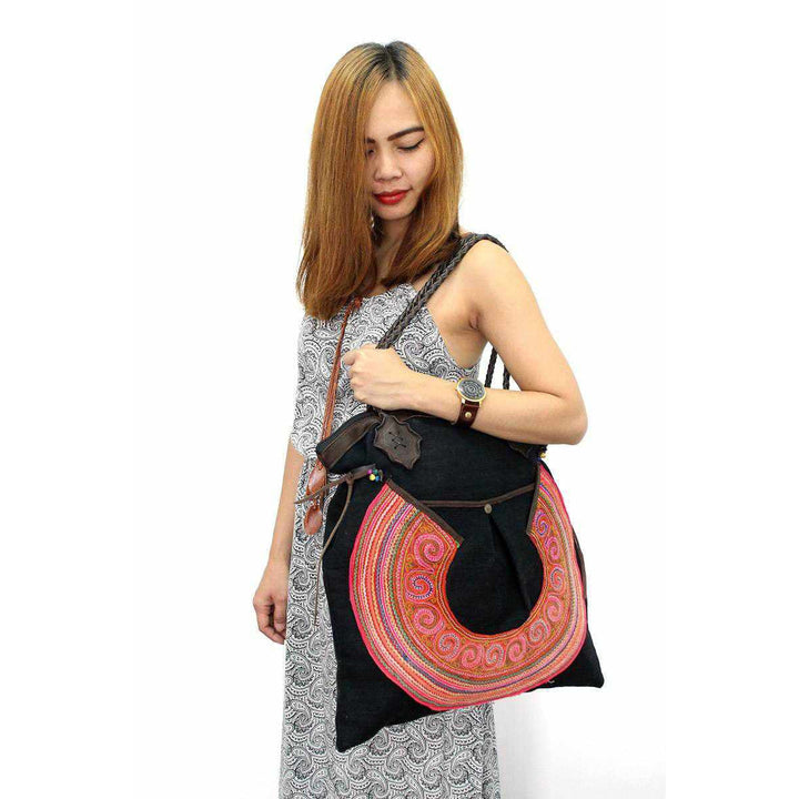 Gorgeous fabric up-cycled from a traditional Hmong traditional jacket is used to make this gorgeous, limited edition bag. Soft leather is braided to create a beautiful strap. Lined inside with inner pocket.