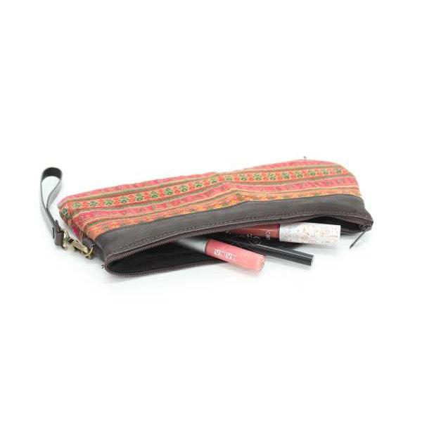 Our vintage Hmong wristlet is handmade with an array of hill-tribe fabrics, in Northern Thailand by our women artisans. The bag has a zipper closure and a leather handle for your wrist. A great gift idea and sure to get lots of compliments!