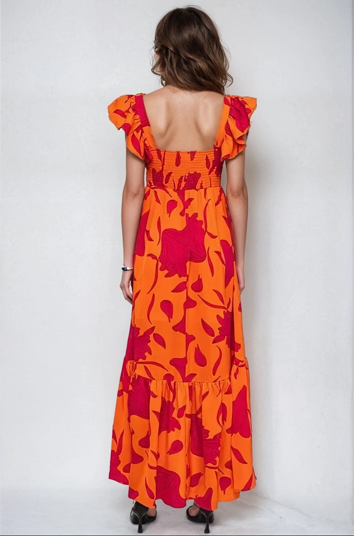 The dress features a lively orange and fuchsia floral print that captures the essence of tropical beauty, making you feel as though you're walking through a vibrant garden paradise. The romantic flutter sleeves add a touch of whimsy, beautifully complemented by delicate ruffle details that enhance your every move.