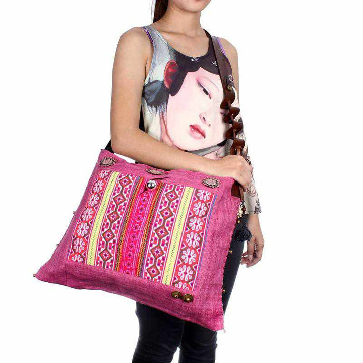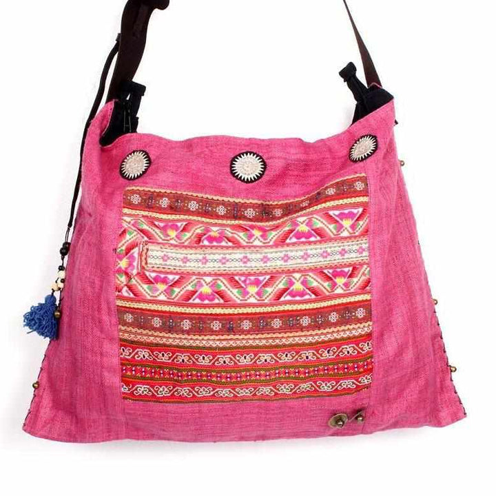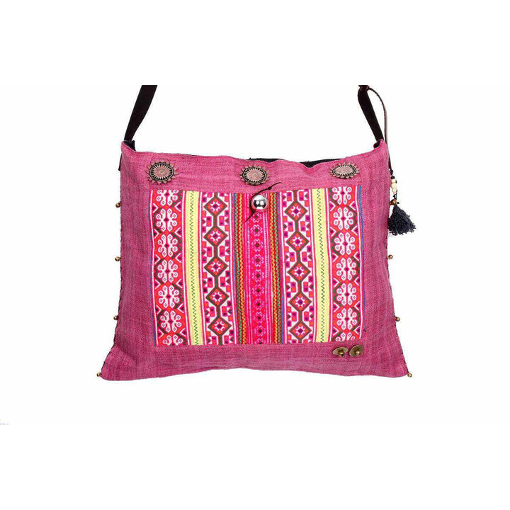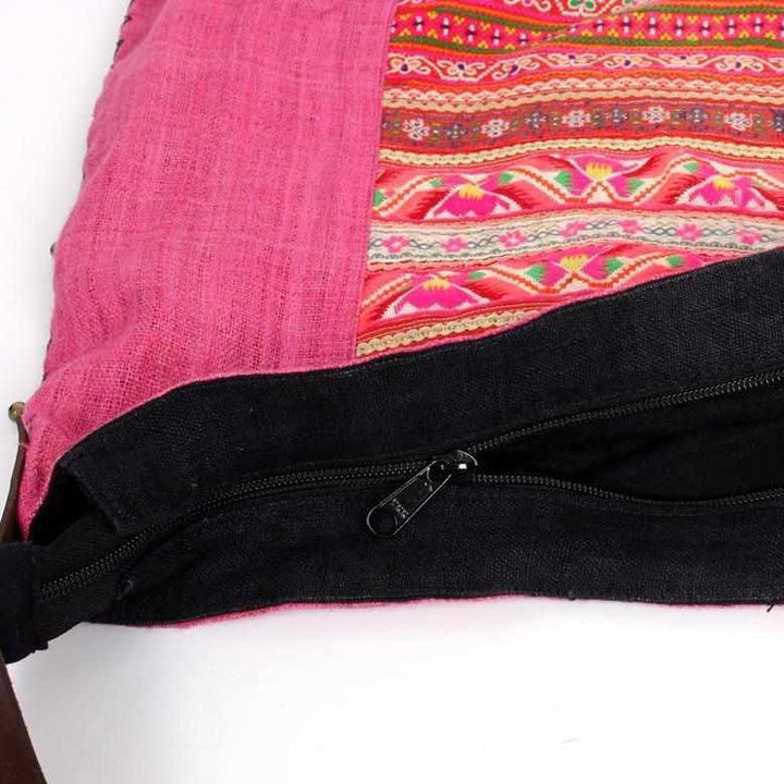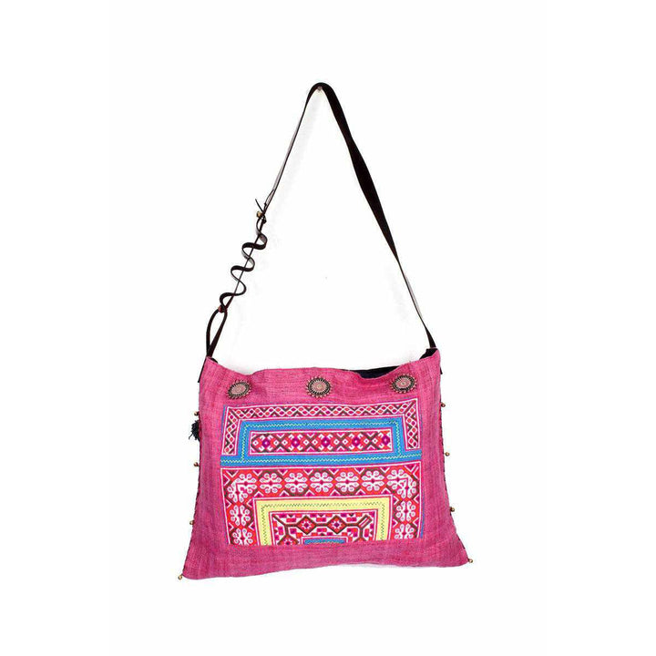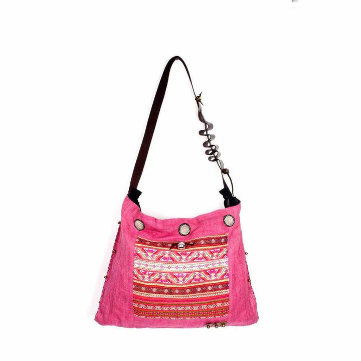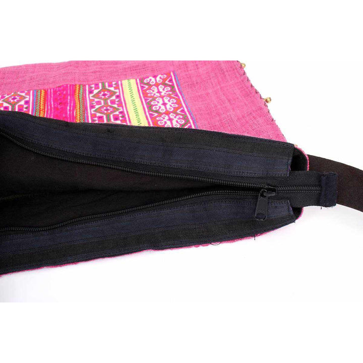 Colorful hemp fabric in hot pink is matched with vintage Hmong fabric to create this gorgeous one of a kind piece. Finished with a sturdy, adjustable leather strap you can adjust to use this as a shoulder bag and a crossbody bag. Lined inside with pockets to keep you organized.