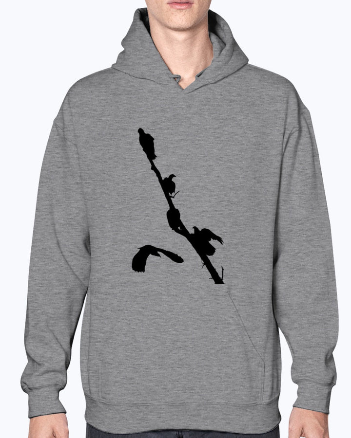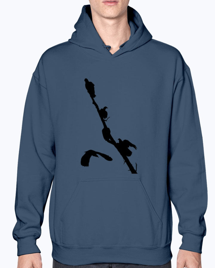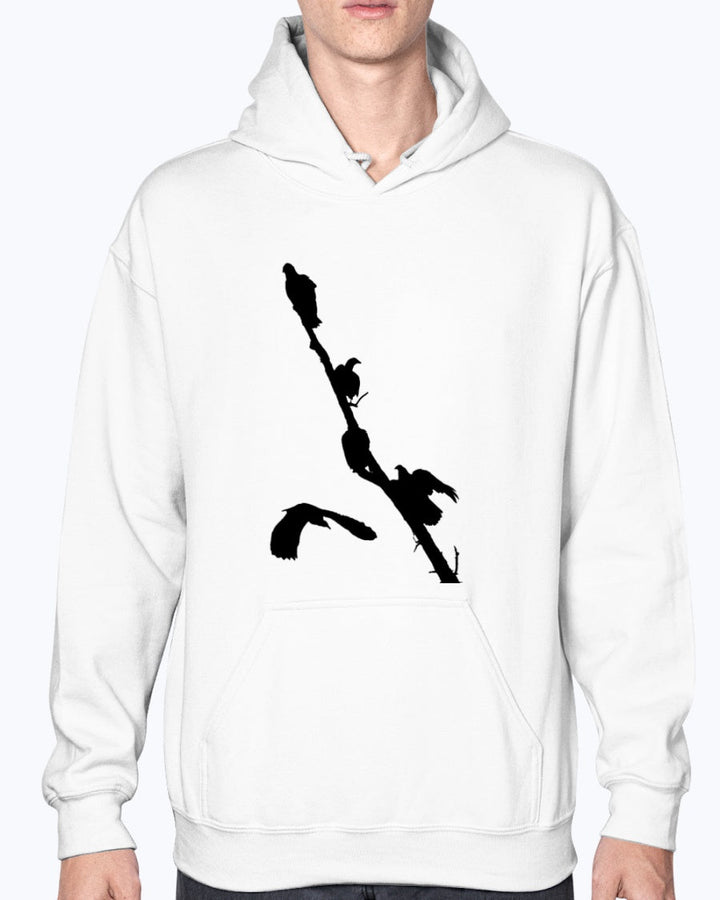 Step into comfort and style with our Moss Apparel "Vultures Lurking" Hoodie, a captivating piece that's sure to turn heads. This isn't just cozy apparel; it's a unique statement, featuring an evocative photograph by Robert Moss. The striking image captures silhouetted vultures perched on a bare tree branch, creating a spooky yet utterly intriguing aesthetic.