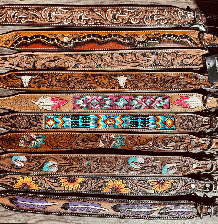 Western leather dog collar tooled or beaded details skull sunflower feather rhinestone by Double B Wild Rags