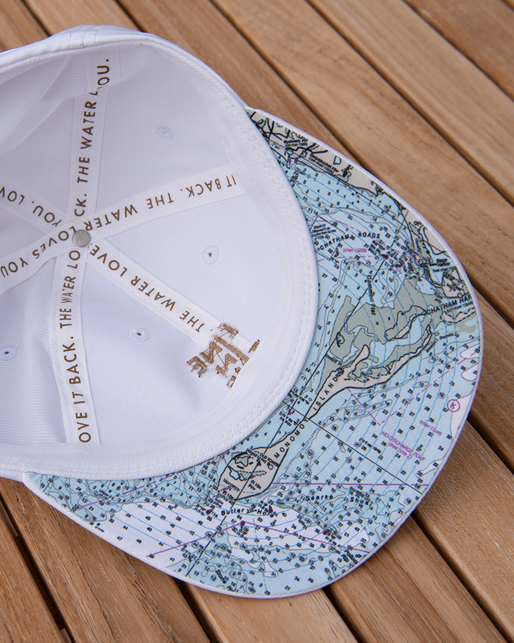 Under the cap, you’ll find the secret message, “The Water Loves You. Love It Back” (all styles) and a nautical chart of Monomoy Island (select styles). Just for you.