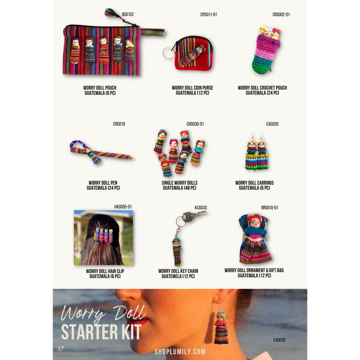 Introducing our Worry Doll Starter Kit, a comprehensive collection that includes 9 different worry doll products, totaling 150 pieces. Each piece is handcrafted in Guatemala and showcases the rich cultural heritage of the Mayan artisans who create them.