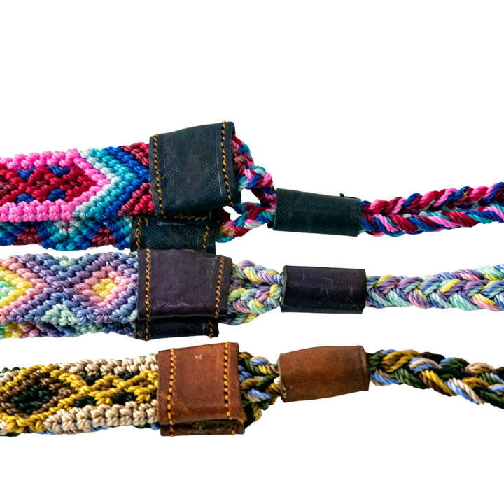 Elevate your hat game and support fair trade practices with our Macrame Woven Hat Bands. Handmade by Mica and her family in the highlands of Mexico, each band showcases a unique and colorful patterned design using traditional macrame techniques.